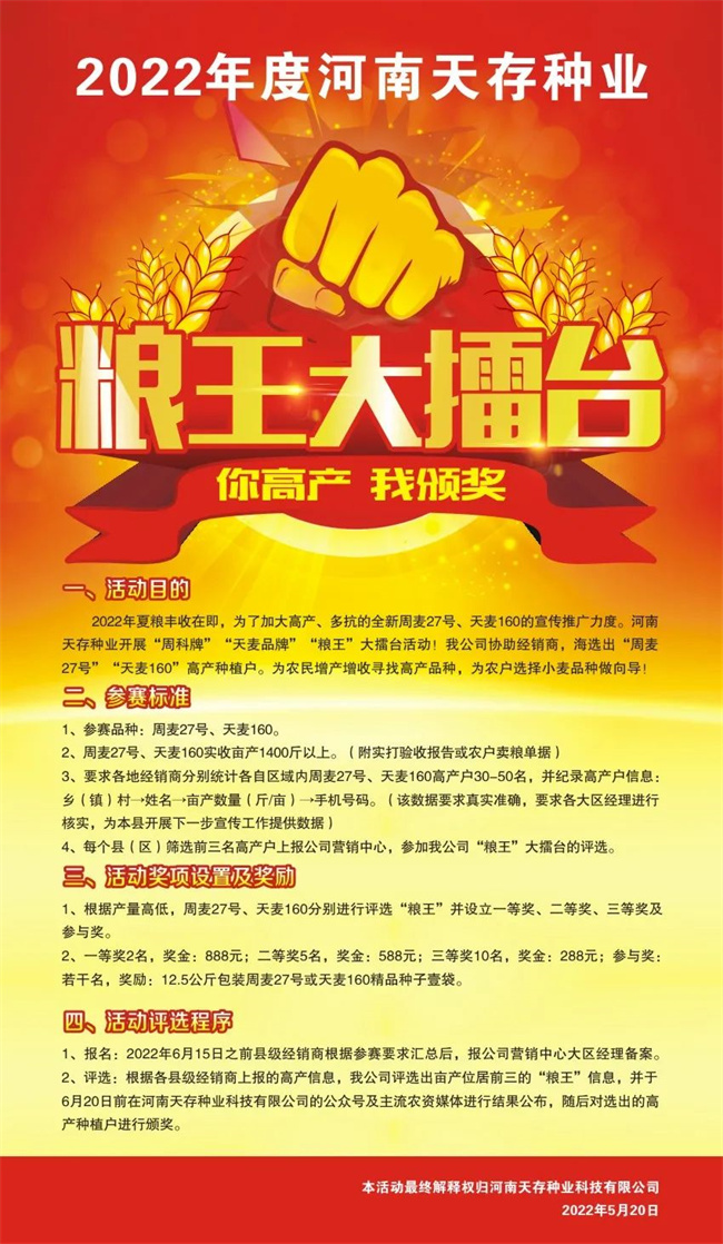 2022年河南天存種業(yè)全新周麥27號、天麥系列新品種喜獲豐收!各地頻傳捷報。近日,天存種業(yè)根據(jù)“糧王”大擂臺活動規(guī)則,海選出了2022年度河南天存種業(yè)“糧王”大擂臺高產(chǎn)種植戶,活動獎勵將擇日進行頒獎!現(xiàn)將高產(chǎn)種植戶名單公布如下:
