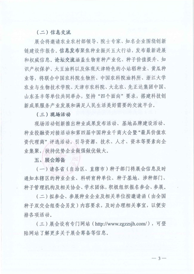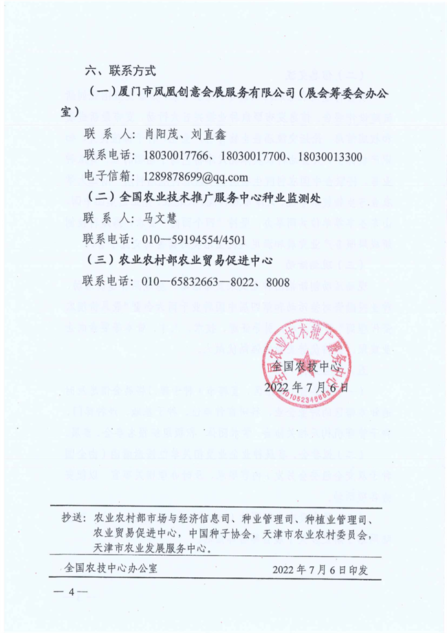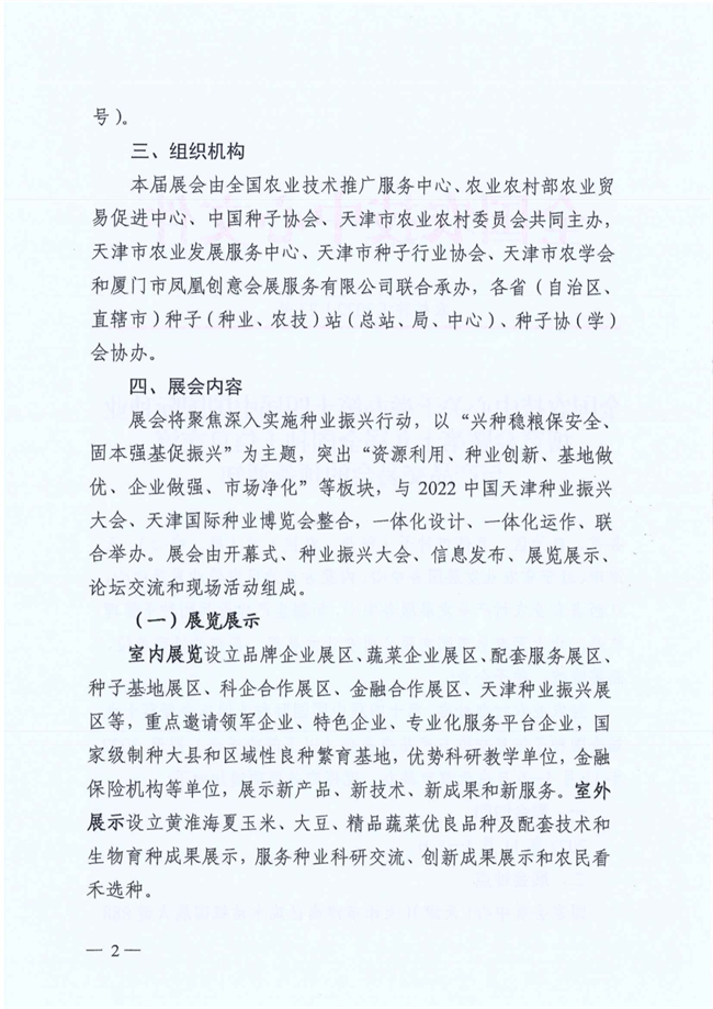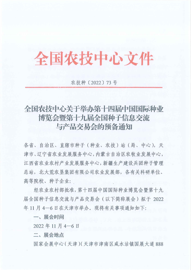 經(jīng)農(nóng)業(yè)農(nóng)村部批準(zhǔn),第十四屆中國國際種業(yè)博覽會暨第十九屆全國種子信息交流與產(chǎn)品交易會(以下簡稱展會)擬于2022年11月4—6日在天津市舉辦?,F(xiàn)將有關(guān)事項通知如下:
