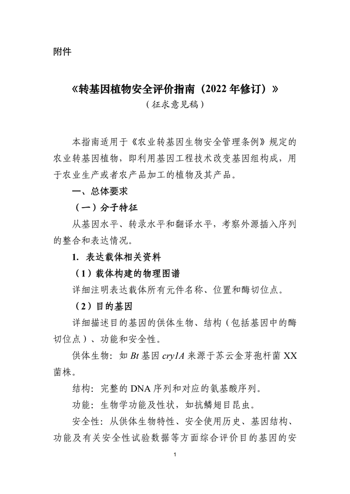 根據(jù)《農(nóng)業(yè)轉(zhuǎn)基因生物安全管理條例》《農(nóng)業(yè)轉(zhuǎn)基因生物安全評價管理辦法》等有關(guān)規(guī)定,為進一步規(guī)范農(nóng)業(yè)轉(zhuǎn)基因生物安全評價工作,農(nóng)業(yè)農(nóng)村部農(nóng)業(yè)轉(zhuǎn)基因生物安全管理辦公室組織修訂了轉(zhuǎn)基因植物安全評價指南,現(xiàn)向社會公開征求意見。請于2022年7月29日前以書面或電子郵件形式反饋意見。