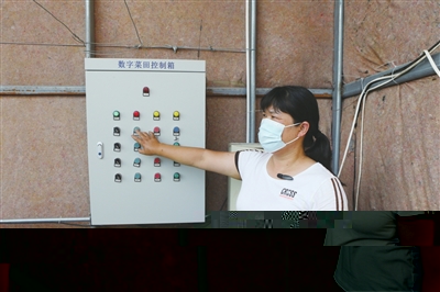 郭澤紅操作數(shù)字菜田控制箱,自動(dòng)卷簾機(jī)快速展開(kāi)。