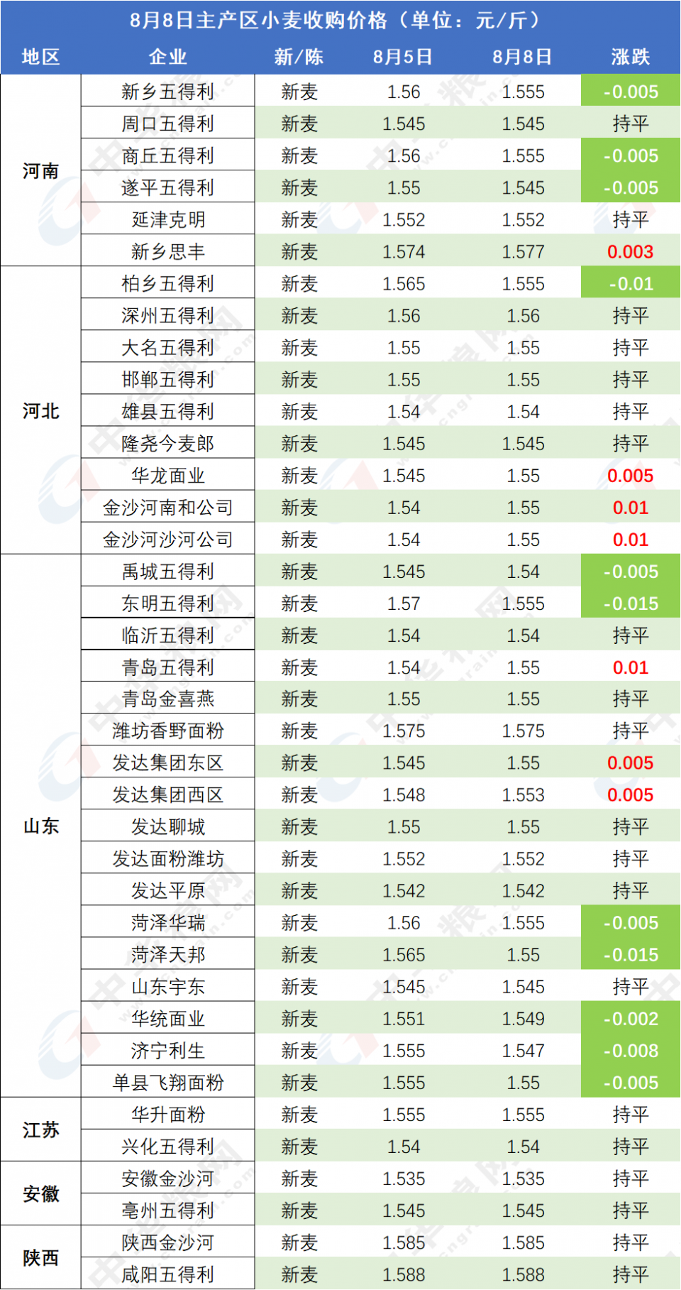 8月8日主產(chǎn)區(qū)小麥?zhǔn)召?gòu)價(jià)格