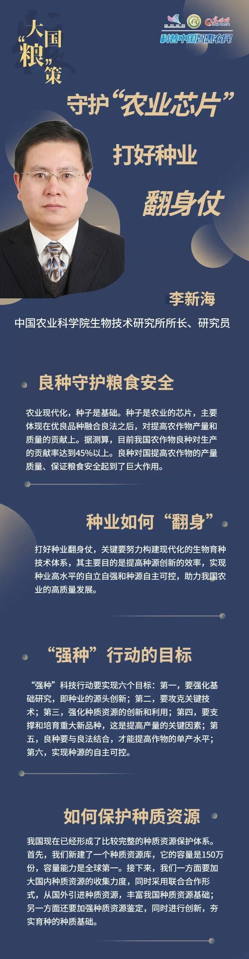 光明網(wǎng)聯(lián)合科普中國、中國農(nóng)業(yè)科學(xué)院、農(nóng)業(yè)農(nóng)村部人力資源開發(fā)中心、中國農(nóng)學(xué)會,推出《大國“糧”策專家談》欄目,邀請專家們暢談“糧”策。本期《大國“糧”策專家談》邀請到了中國農(nóng)業(yè)科學(xué)院生物技術(shù)研究所所長、李新海研究員,請他來聊一聊應(yīng)該如何發(fā)揮科技力量,保護好我們的“農(nóng)業(yè)芯片”。