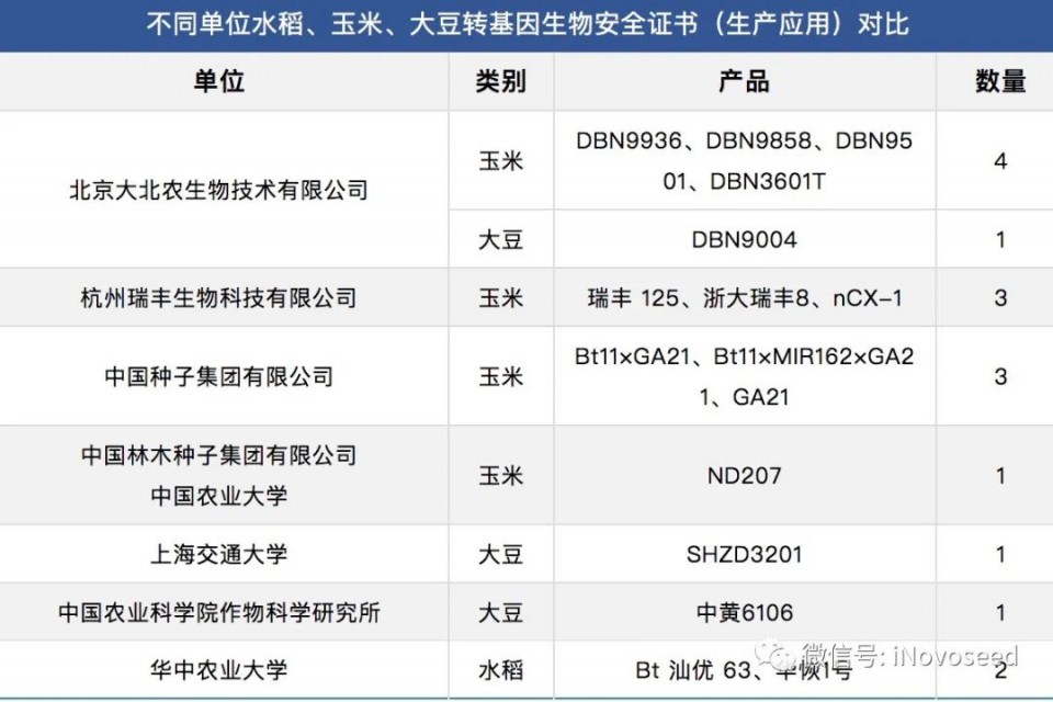 經(jīng)國家審批拿到安全證書的轉(zhuǎn)化體情況目前拿到安全證書的有四家單位,共11個轉(zhuǎn)化體,在抗蟲和抗除草劑方面各有優(yōu)勢,這些轉(zhuǎn)化體有的只有抗蟲基因,有的是抗蟲抗除草劑基因連鎖。大家可根據(jù)自身情況選擇合作。