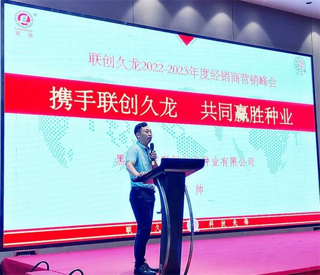 本會議由聯(lián)創(chuàng)久龍營銷總監(jiān)蔡軍主持。2022年8月,是具有歷史意義的月份,北京聯(lián)創(chuàng)種業(yè)有限公司和黑龍江省久龍種業(yè)有限公司重組為黑龍江省聯(lián)創(chuàng)久龍種業(yè)有限公司,強強聯(lián)合,優(yōu)勢互補,新的聯(lián)創(chuàng)久龍將會以全新的面貌助力各位合作伙伴更上一層樓,譜寫新輝煌!