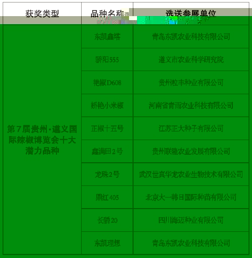 8月16日,專家組根據(jù)參賽辣椒品種的產(chǎn)量、果實(shí)商品性、純度、抗逆表現(xiàn)及內(nèi)在品質(zhì)檢測(cè)結(jié)果,按得分排名評(píng)選出20個(gè)優(yōu)秀品種,按辣椒類型分類排名順序取前10名授予“十大新優(yōu)品種”稱號(hào),后10名授予“十大潛力品種”稱號(hào),將在辣博會(huì)上給予發(fā)布推介。獲獎(jiǎng)品種如下: