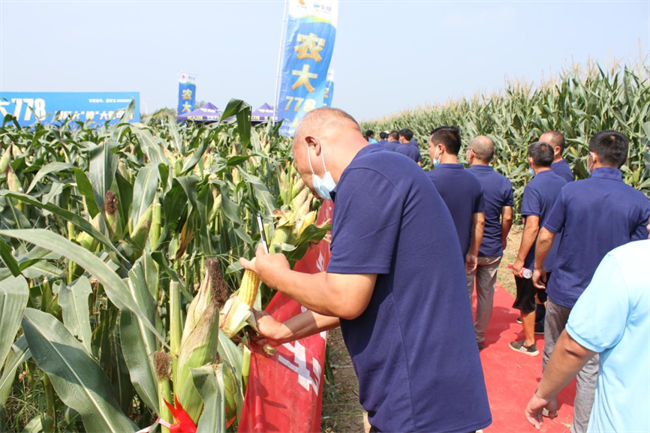 “你看,它的根系比較發(fā)達(dá),粗壯,抗倒性能力好;穗位整齊,棒子大,籽粒飽滿(mǎn),產(chǎn)量有保證。”一位來(lái)自扶溝的經(jīng)銷(xiāo)商在觀摩現(xiàn)場(chǎng)分析了農(nóng)大778品種優(yōu)勢(shì)。”