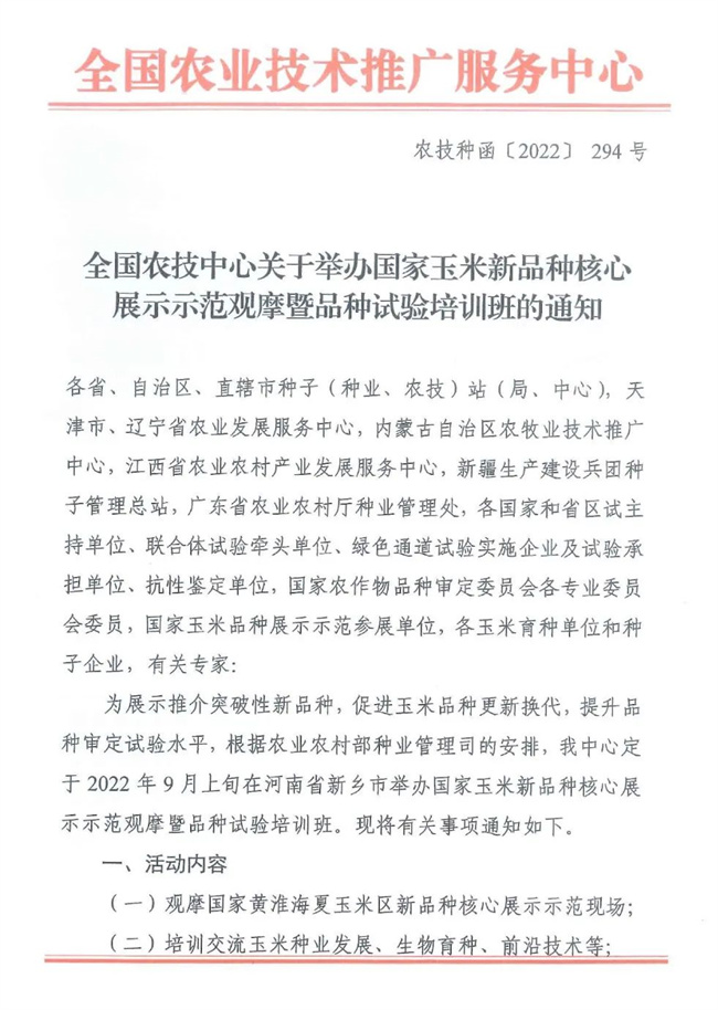 全國農(nóng)技中心關(guān)于舉辦國家玉米新品種核心展示示范觀摩暨品種試驗培訓(xùn)班的通知