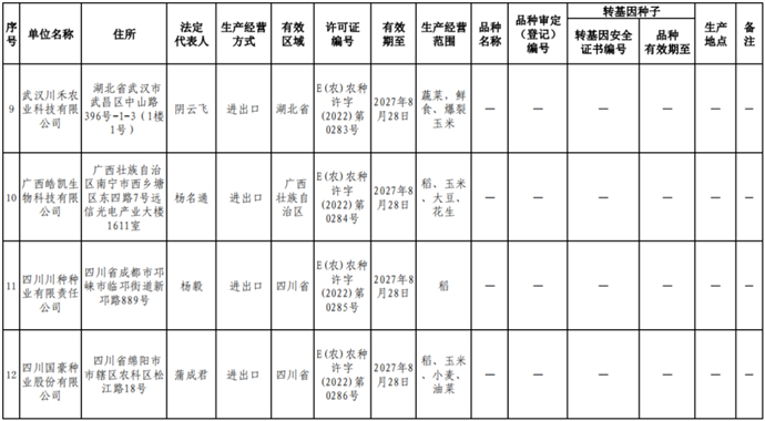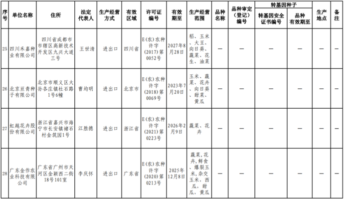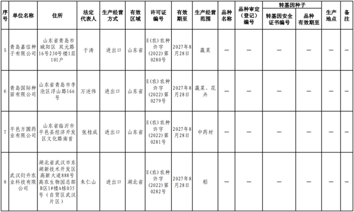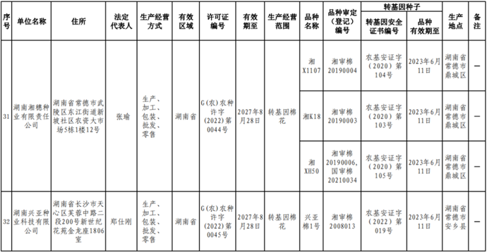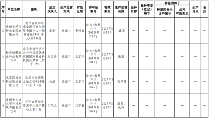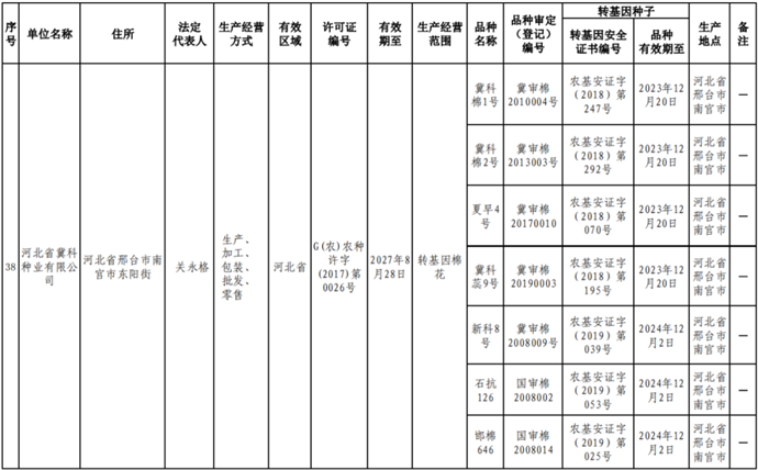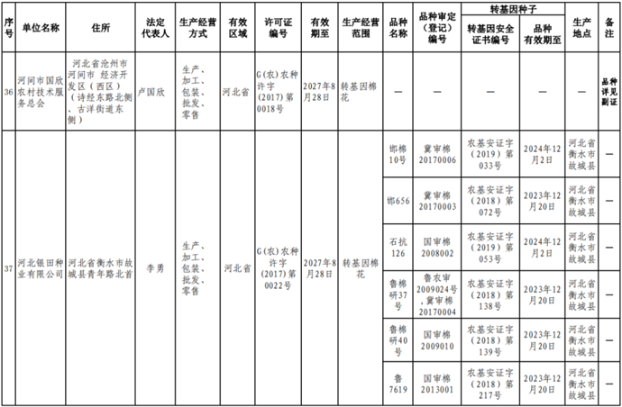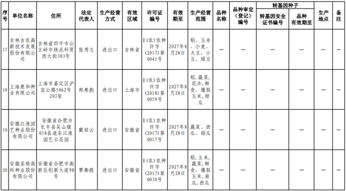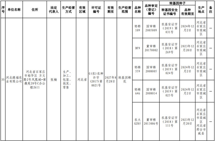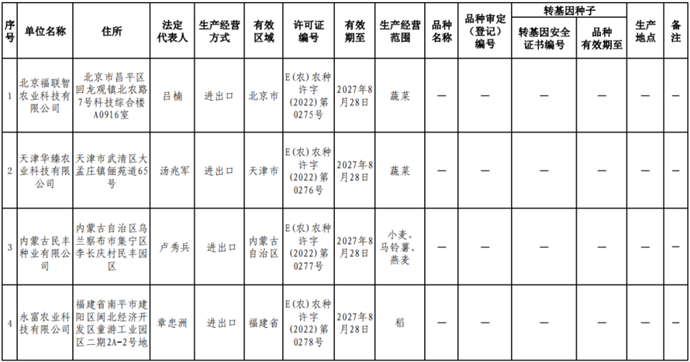 根據(jù)《中華人民共和國(guó)種子法》《農(nóng)業(yè)轉(zhuǎn)基因生物安全管理?xiàng)l例》和《農(nóng)作物種子生產(chǎn)經(jīng)營(yíng)許可管理辦法》等有關(guān)規(guī)定,批準(zhǔn)發(fā)放北京福聯(lián)智農(nóng)業(yè)科技有限公司等38家企業(yè)農(nóng)作物種子生產(chǎn)經(jīng)營(yíng)許可證(詳見附件)。