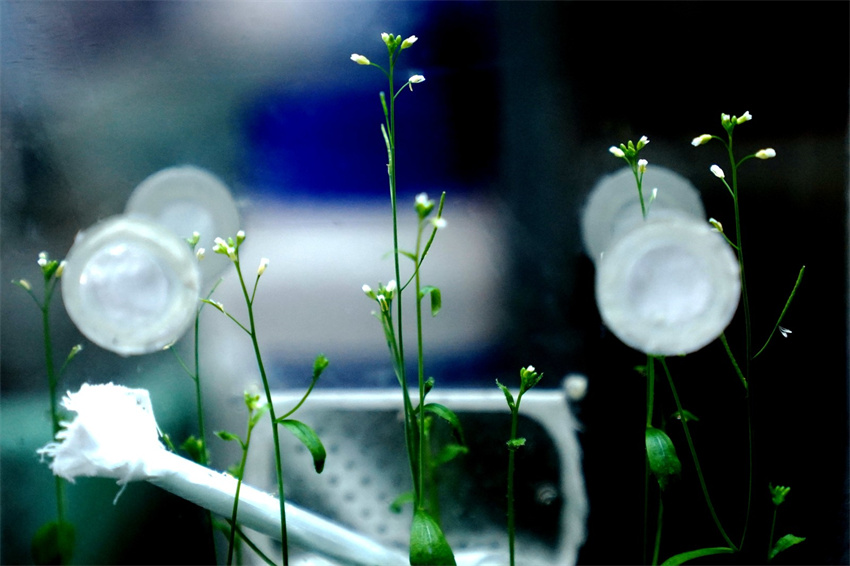 這是“太空同款”擬南芥培養(yǎng)單元中擬南芥開的花。 新華社記者 張建松 攝