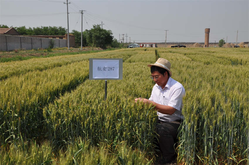 劉錄祥研究員田間調(diào)查太空小麥。(來源:中國農(nóng)業(yè)科學(xué)院作物科學(xué)研究所)