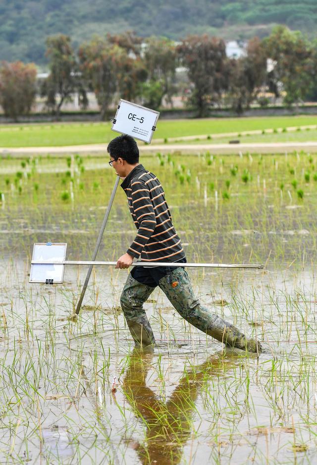 2021年3月29日,華南農(nóng)業(yè)大學(xué)國家植物航天育種工程技術(shù)研究中心王加峰博士為剛剛插秧太空稻的試驗(yàn)田插上寫著“CE-5”的標(biāo)識牌,這是嫦娥五號的拼音縮寫。當(dāng)日,嫦娥五號搭載的太空稻種離開研究中心溫室,移栽到試驗(yàn)田基地。新華社記者 劉大偉 攝
