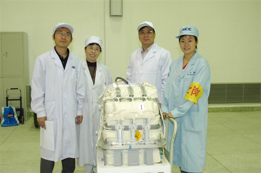 劉錄祥(右二)和工作人員在實(shí)踐八號育種衛(wèi)星發(fā)射前完成載荷安裝。(來源:中國農(nóng)業(yè)科學(xué)院作物科學(xué)研究所)