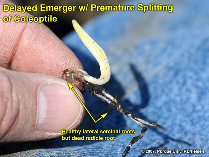 圖 4-6 顯示了一塊田中出苗延遲的示例。初生胚根完全被破壞,盡管次生胚根完整且健康。胚芽鞘已被撕裂開,很可能導(dǎo)致地下生葉。胚芽鞘分裂很可能是由于封閉的葉子自然持續(xù)的膨脹,否則這些葉子通常會出現(xiàn)在地上。