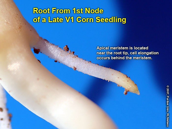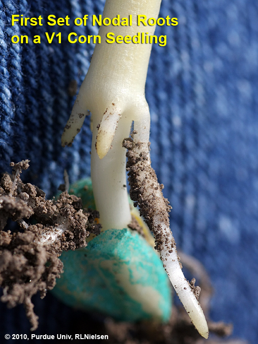 胚根系統(tǒng)通過從土壤中吸收水分來幫助維持幼苗的發(fā)育,但玉米幼苗主要依賴于籽粒淀粉胚乳的能量儲備來提供營養(yǎng),直到節(jié)根系統(tǒng)得以發(fā)育。大約在生長階段V1之前,隨著初生節(jié)根系統(tǒng)從中胚軸(mesocotyl)上方的節(jié)開始發(fā)育,胚根系統(tǒng)的生長速度急劇下降。