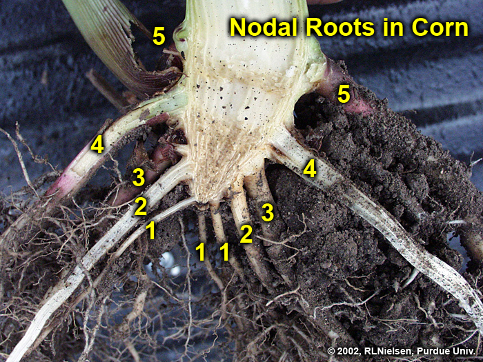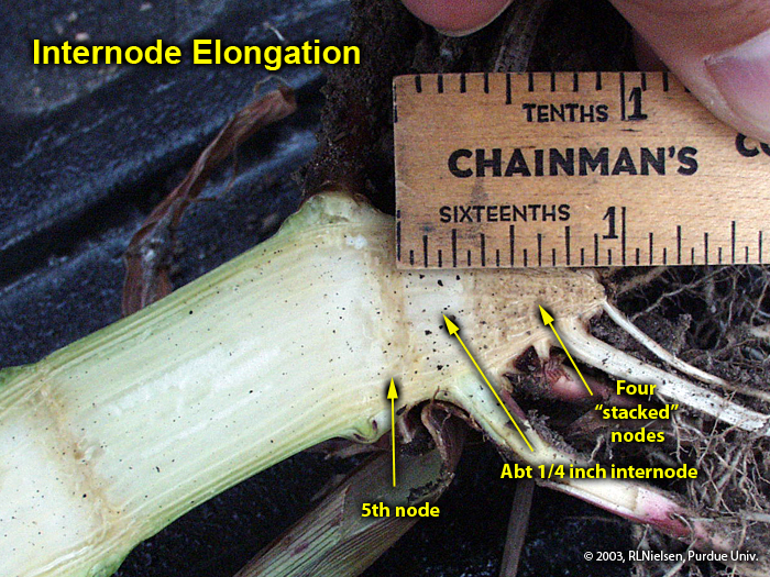 莖組織的伸長在 V4 和 V5 之間開始。第五節(jié)上方的節(jié)間伸長通常會使第六節(jié)高于地面。隨后延伸的莖桿節(jié)間數(shù)量增加,將導(dǎo)致其余莖桿節(jié)的位置越來越高。在地面莖桿節(jié)上方形成的節(jié)根通常稱為“支撐”根,但其功能與在地下形成的那些節(jié)點根相同。如果表層土壤條件適宜(潮濕且不會過熱),則支撐根將成功穿透土壤,擴散并有效吸收土壤上層的水分和養(yǎng)分。