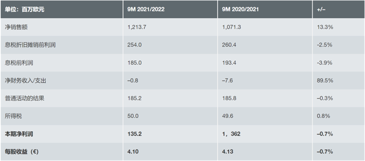 2022年5月12日,科沃施公布 2021/2022 財(cái)年前9個(gè)月的業(yè)績(jī)。KWS 集團(tuán)在 2021/2022 財(cái)年的前 9 個(gè)月銷售額增長(zhǎng)了約 13%。期間EBITDA、EBIT等結(jié)果達(dá)到了上一年的水平。