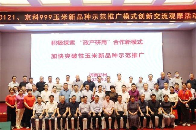 糧安天下,種鑄基石。為探索“政產(chǎn)研用”合力展示、示范優(yōu)良品種新模式,加快我國自主知識(shí)產(chǎn)權(quán)突破性玉米新品種的推廣應(yīng)用,9月8日,全國農(nóng)業(yè)技術(shù)推廣服務(wù)中心、北京市農(nóng)林科學(xué)院在河南省鄭州市聯(lián)合舉辦MC121-京科999玉米新品種示范推廣模式創(chuàng)新交流觀摩活動(dòng)。全國農(nóng)技中心有關(guān)領(lǐng)導(dǎo)、北京農(nóng)林科學(xué)院主管領(lǐng)導(dǎo),北京、河南等12個(gè)?。▍^(qū)、市)農(nóng)業(yè)(農(nóng)牧)農(nóng)村廳(局、委)種業(yè)管理處農(nóng)作物種業(yè)工作負(fù)責(zé)同志以及種子事業(yè)單位品種審定試驗(yàn)分管領(lǐng)導(dǎo),河南現(xiàn)代、安徽豐大等相關(guān)種業(yè)企業(yè)負(fù)責(zé)人,部分基層農(nóng)技推廣人員、種植大戶代表共60余人參加活動(dòng)。