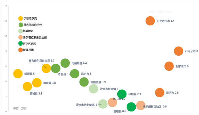 銷量排名前五的品種里面,除了華西 948 是中晚熟品種,其余均為中熟產品(積溫2450-2600攝氏度),這些中熟品種的普遍共性是有非常廣的適宜種植區(qū)域,基本把幾個較大的區(qū)域都覆蓋到(伊犁地區(qū)、博樂地區(qū)、塔城地區(qū)、阿勒泰地區(qū))。