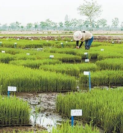 江蘇省宿遷市沭陽縣青伊湖鎮(zhèn)的江蘇歡騰農(nóng)業(yè)水稻育種基地,工作人員為不同的水稻秧苗插上標簽,進行“身份”識別。該基地與中國科學院遺傳與發(fā)育生物學研究所合作,進行500多份雜交稻和常規(guī)稻的品種比較試驗,擁有自主研發(fā)新品種19個。