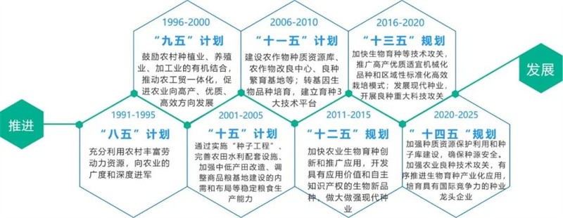 我國(guó)國(guó)民經(jīng)濟(jì)“八五”計(jì)劃至“十四五”規(guī)劃中,對(duì)種子行業(yè)的發(fā)展要求不斷在更迭、變遷,從“鼓勵(lì)充分利用農(nóng)村勞動(dòng)力資源,到精準(zhǔn)提出種子工程計(jì)劃,再到保障種子基礎(chǔ)設(shè)施及技術(shù)平臺(tái)的建設(shè),以及進(jìn)一步推進(jìn)生物育種及種質(zhì)資源保護(hù),培育具有國(guó)際競(jìng)爭(zhēng)力的種業(yè)龍頭企業(yè)”逐步深層次變遷。
