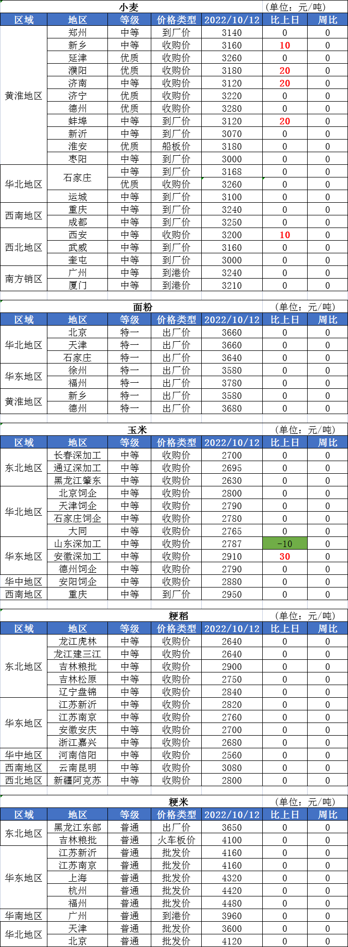 1、10月12日,新疆臨儲小麥拍賣共投放41359噸,全部成交。其中白小麥26220噸,最高成交價3350元/噸,成交均價2901元/噸;高寒白小麥15139噸,最高成交價2940元/噸,成交均價2772元/噸。