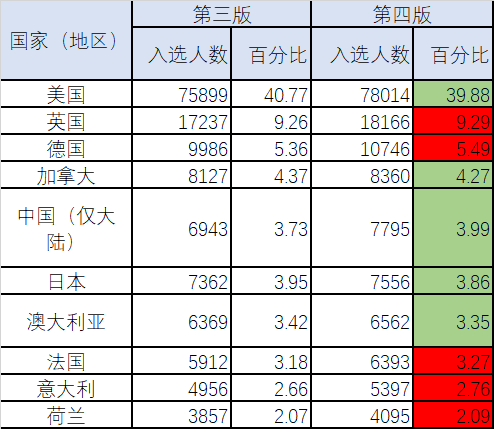 2022年10月發(fā)布的排名共收錄來自22個學科領域的195606名科學家,其中標注美國(USA)的科學家78014名,占總收錄人數(shù)的39.88%。標注中國大陸(CHN)的科學家7795,比第三版增加852人,超過日本,在全球排第5位。