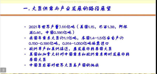 2021年,我國大豆平均產(chǎn)量130.16公斤/畝,世界大豆平均單產(chǎn)188.84公斤/畝,與世界相比,我國大豆單產(chǎn)水平與世界平均水平仍有很大差距。只有通過常規(guī)育種與分子技術(shù)、光譜技術(shù)和信息技術(shù)相結(jié)合,充分挖掘育種材料基因利用技術(shù),實現(xiàn)育種技術(shù)創(chuàng)新性突破,建立種業(yè)與栽培技術(shù)相配合長效服務(wù)體系,努力提高我國大豆單產(chǎn)水平。