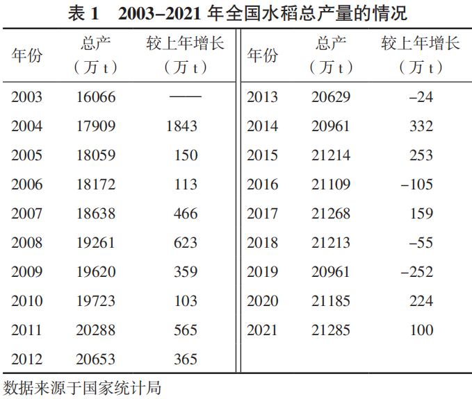 2020年FAO數(shù)據(jù)顯示,中國水稻面積占世界18.3%,總產(chǎn)占世界的28%。2003年以來,全國水稻總體呈現(xiàn)快速發(fā)展的勢頭(表1)。從總產(chǎn)看,2011年以來連續(xù)11年穩(wěn)定在2億t以上;2018-2019年受結(jié)構(gòu)性調(diào)整的影響,總產(chǎn)略減;2021年水稻總產(chǎn)達到歷史最高產(chǎn)量21285萬t,比2003年增產(chǎn)5219萬t,增幅達到32%。