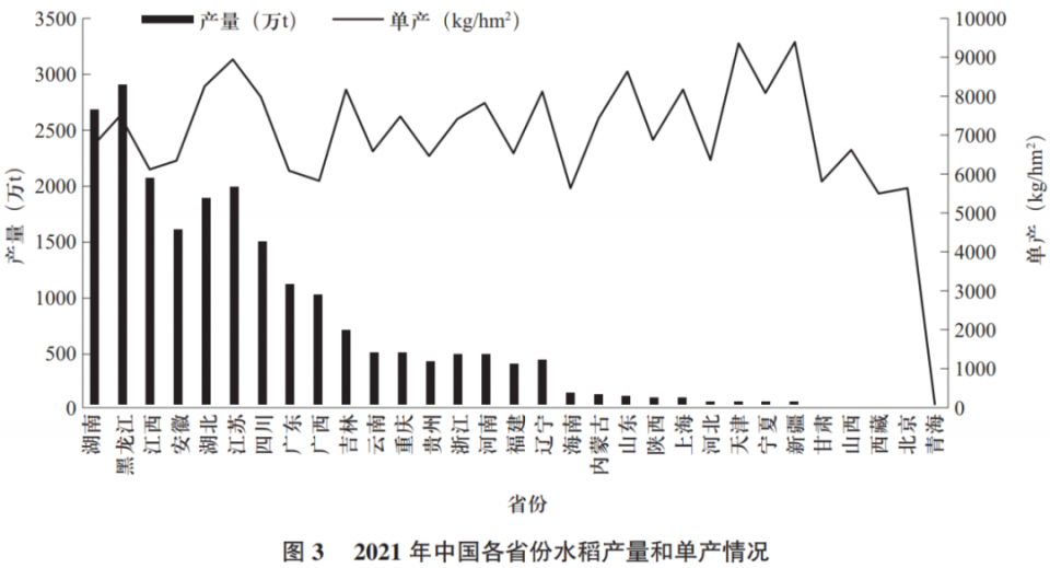 從各省的水稻種植情況看(圖2、圖3),2021年湖南水稻種植面積397.11萬hm²,排名第一,緊隨其后的黑龍江種植面積為386.74萬hm²,江西種植面積為341.92萬hm²。產(chǎn)量排名基本與種植面積一致,但單產(chǎn)水平卻不同,可以看到,排名第一的是新疆,單產(chǎn)9406.5kg/hm²;天津排名第二,單產(chǎn)9355.5kg/hm²,單產(chǎn)在7500kg/hm²(500kg/667m²)的?。▍^(qū)、市)有江蘇、山東、湖北、上海、吉林、遼寧、寧夏、四川、河南和黑龍江。湖南種植面積最大,單產(chǎn)6756kg/hm²,排在上述省份之后。