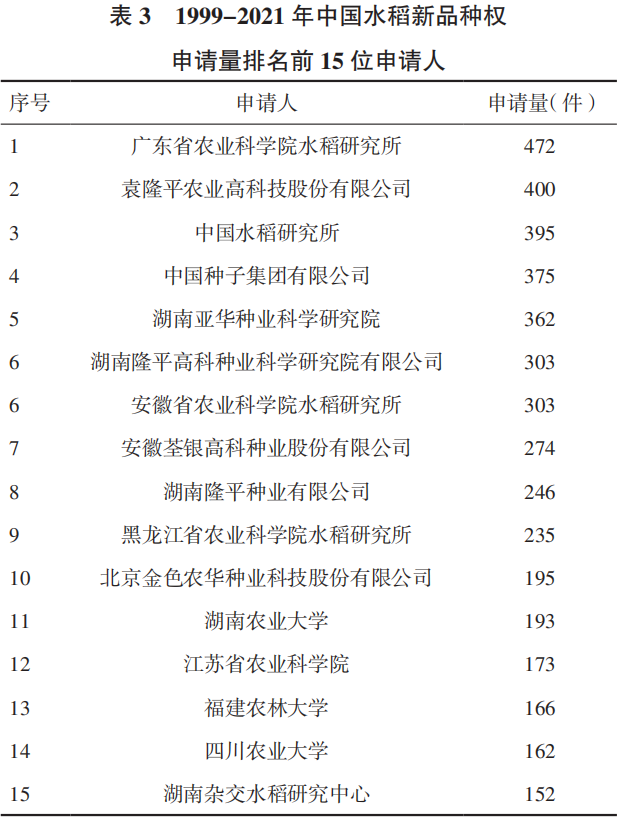從個人或機構(gòu)申請量來看(表3),申請量排名前15名(有兩個并列第6名,共16家單位)的申請人共申請了4406件,占水稻總申請量的34.32%,其中排名前3位的是廣東省農(nóng)業(yè)科學院水稻研究所申請了472件;袁隆平農(nóng)業(yè)高科技股份有限公司申請了400件;中國水稻研究所申請了395件。