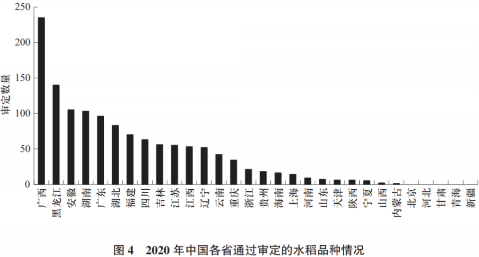從2020年各省情況來看(表4、圖4),審定數(shù)量最多的是廣西,共審定235個品種;審定數(shù)量在100個以上的分別是黑龍江140個、安徽105個、湖南103個。