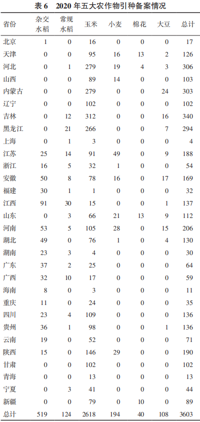 從引種備案情況來看(表6),2020年全國共引種備案主要農(nóng)作物3603個。其中水稻643個、玉米2618個、小麥194個、大豆108個、棉花40個。水稻引種數(shù)量排名前5位的省份分別是江西121個、安徽58個、河南58個、湖北49個、廣西42個(表6)。