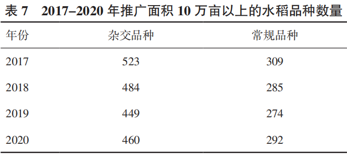 從推廣面積來看(表7),2017-2020年推廣面積10萬畝(6667hm²)以上的雜交水稻品種維持在449~523個,常規(guī)水稻品種維持在300個左右。