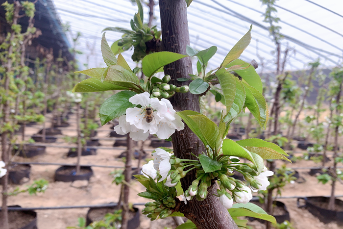 當節(jié)氣的腳步走近霜降的驛站,古徵大地已是“秋風蕭瑟天氣涼,草木搖落露為霜”,但走進澄城縣馮原鎮(zhèn)尖咀的櫻桃溫室大棚里,像提前迎來了春天,綠葉翠嫩、繁花盛開,一簇簇粉紅的鮮花掛滿枝頭,嬌艷欲滴,蜜蜂穿梭其間。