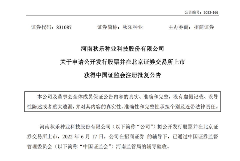 小貼士:根據(jù)公開數(shù)據(jù)顯示,秋樂(lè)種業(yè)(831087)2021年?duì)I業(yè)收入為338565907元,歸屬母公司凈利潤(rùn)為40074040元,凈資產(chǎn)收益率為16.26%,營(yíng)業(yè)收入增長(zhǎng)率為24.6%。目前主辦券商為招商證券,交易方式為集合競(jìng)價(jià)交易,歸屬創(chuàng)新層。
