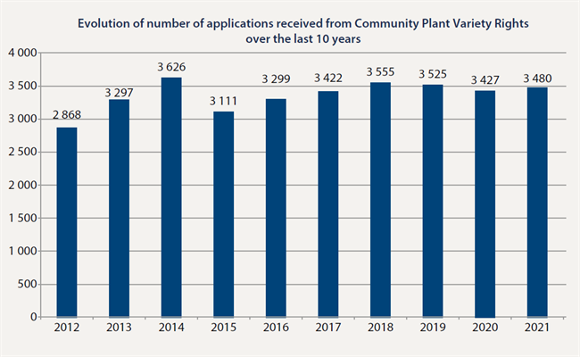 2021年CPVO共受理植物新品種申請(qǐng)3480件,相比去年增長了2%。在過去5年中,申請(qǐng)量一直穩(wěn)定在這個(gè)水平。