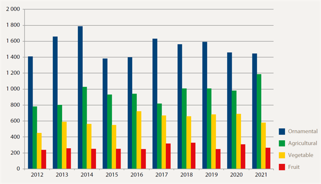圖3 2012-2021年歐盟不同植物類別申請(qǐng)量/件