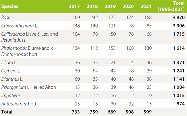 2017-2021年申請(qǐng)量排前10的觀賞植物種類有:薔薇屬、菊屬、舞春花和矮牽牛、蝴蝶蘭屬和朵麗蝶蘭屬、百合屬、大丁草屬、石竹屬、天竺葵屬、鳳仙花屬、花燭屬。