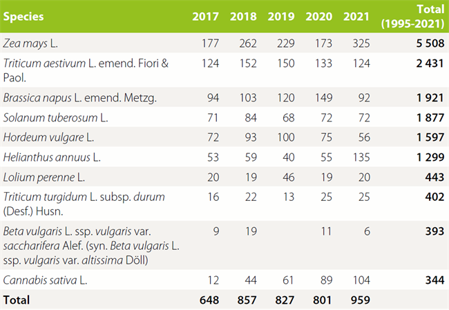 2017-2021年申請(qǐng)量排前10的農(nóng)作物種類有:玉米、普通小麥、甘藍(lán)型油菜、馬鈴薯、大麥、向日葵、黑麥草、硬粒小麥、糖蘿卜、大麻。