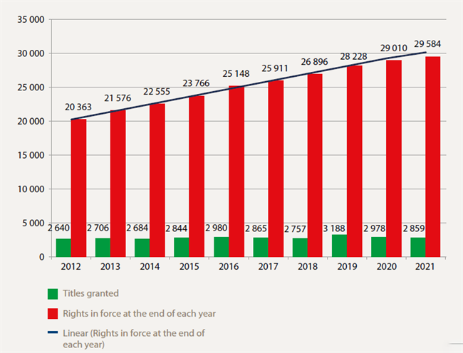 到2021年底,CPVO共授予植物新品種權(quán)594209件,其中29584(50%)件仍然有效。