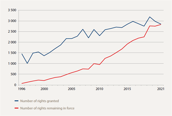 圖5 1996年至2021年授權(quán)量以及到2021年12月31日仍然有效的授權(quán)量