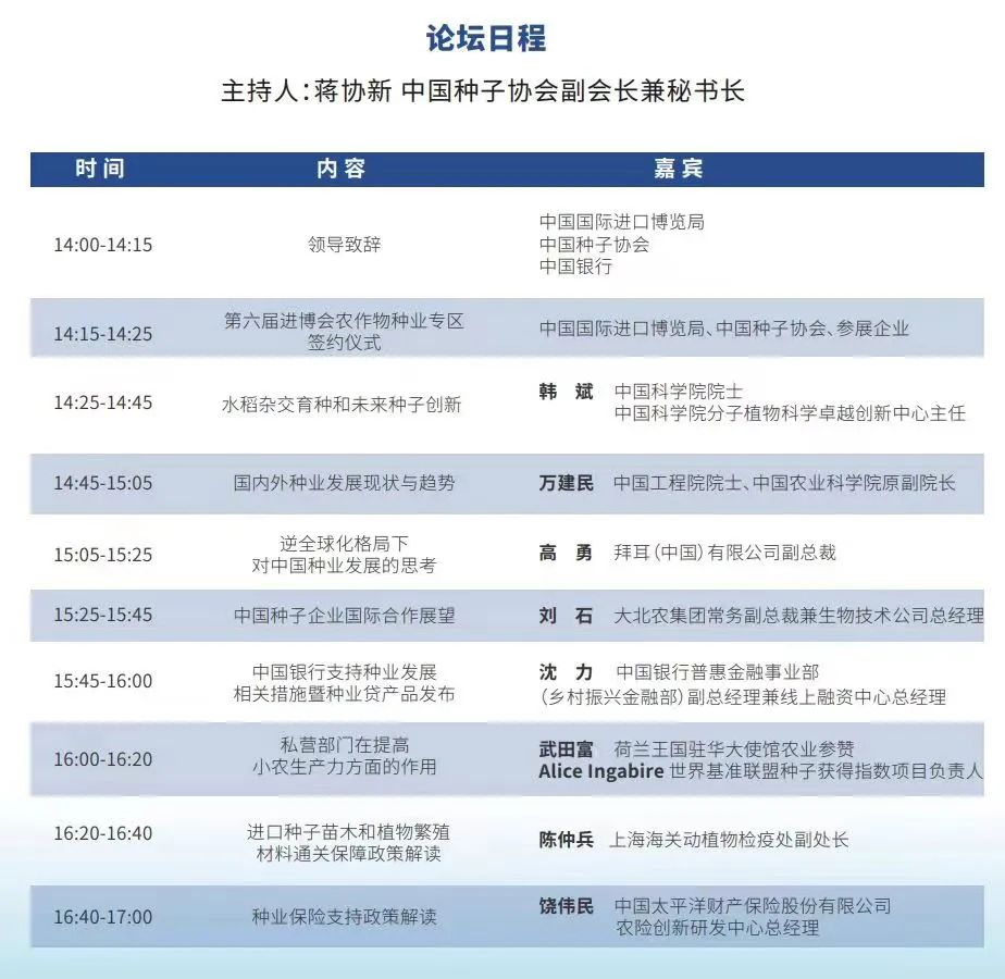 11月7日下午,國內外種業(yè)領域的院士、專家齊聚論壇。中國國際進口博覽局、中國種子協(xié)會、中國銀行相關領導將會發(fā)表致辭。會上,中國國際進口博覽局、中國種子協(xié)會、參展企業(yè)還將進行第六屆進博會種業(yè)專區(qū)參展企業(yè)簽約儀式。