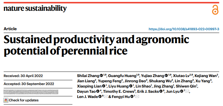 2022年11月7日,云南大學(xué)胡鳳益團(tuán)隊(duì)聯(lián)合國(guó)內(nèi)外相關(guān)團(tuán)隊(duì)在國(guó)際知名學(xué)術(shù)期刊Nature Sustainability發(fā)表了題為Sustained productivity and agronomic potential of perennial rice的研究論文,并同步發(fā)表了題為Switch to perennial rice promotes sustainable farming的研究簡(jiǎn)報(bào),詳細(xì)報(bào)道了該團(tuán)隊(duì)20多年來(lái)通過(guò)種間遠(yuǎn)緣雜交創(chuàng)制多年生稻的研究成果?;趤喼拊耘嗟九c長(zhǎng)雄野生稻種間雜交,該團(tuán)隊(duì)成功創(chuàng)制了多年生稻,培育了系列多年生稻品系,審定了3個(gè)多年生稻品種,在全球多年生糧食作物育種領(lǐng)域具有里程碑意義。