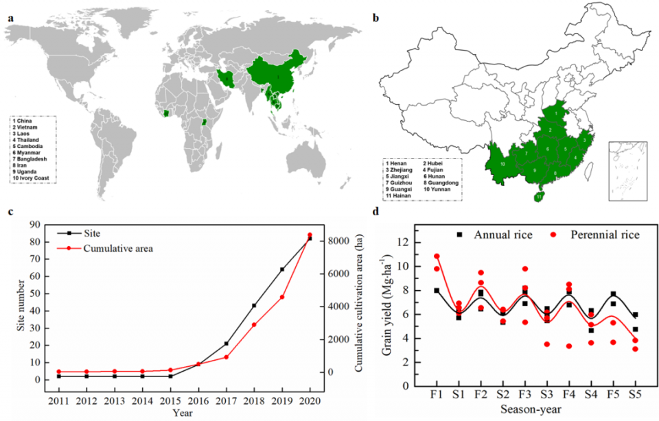 基于免耕生產(chǎn)方式,多年生稻播種一次持續(xù)收獲多年,改善了稻田耕層土壤結(jié)構(gòu),培肥土壤,其土壤有機(jī)質(zhì)和全氮每年分別以0.95噸/公頃和0.11噸/公頃的速率增加。截止2021年,多年生稻已在中國(guó)及南亞?wèn)|南亞和非洲等“一帶一路”沿線多個(gè)國(guó)家試驗(yàn)示范成功,惠及55000余農(nóng)戶。