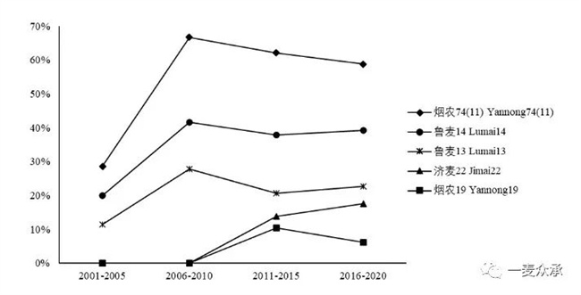 圖3 2000年-2020年煙農(nóng)74(11)、魯麥14等核心親本在山東省的衍生材料統(tǒng)計(jì)圖(翟曉靈等,2022)