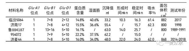 表2 部分優(yōu)質(zhì)小麥的高分子量麥谷蛋白亞基及品質(zhì)相關(guān)指標(biāo)