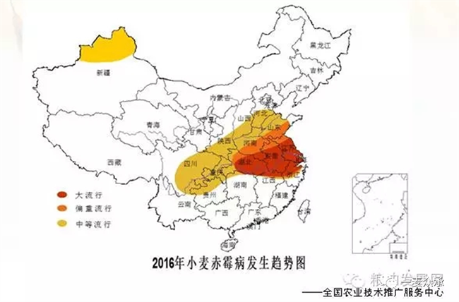 小麥赤霉病又名紅頭瘴、爛麥頭,是由禾谷鐮刀菌等真菌引起的一種世界性小麥病害,在小麥的整個(gè)生育期內(nèi)均可發(fā)生,會(huì)造成大規(guī)模的苗腐和穗腐,其中穗腐一般出現(xiàn)在灌漿后期,對(duì)小麥產(chǎn)量與品質(zhì)的影響最大。近年來(lái),在耕作模式以及氣候等因素的影響下,我國(guó)小麥赤霉病大流行頻率逐漸增加,重發(fā)區(qū)主要集中在長(zhǎng)江中下游冬麥區(qū)、黃淮麥區(qū)南片等區(qū)域(圖7),且有不斷北上的趨勢(shì);赤霉病在山東省的發(fā)病情況從偶發(fā)病害到上世紀(jì)末演變?yōu)槌0l(fā)病害(國(guó)棟等,2019),2021年青島在小麥揚(yáng)花期多雨,導(dǎo)致赤霉病發(fā)生嚴(yán)重。赤霉病不僅影響小麥的產(chǎn)量和品質(zhì),并且會(huì)產(chǎn)生大量霉菌毒素尤其是DON(Deoxynivalenol,脫氧雪腐鐮刀菌烯醇),俗稱“嘔吐毒素”(vomitoxin),被世界衛(wèi)生組織定為三級(jí)致癌物,病麥率含量達(dá)到4%以上就失去了食用價(jià)值。