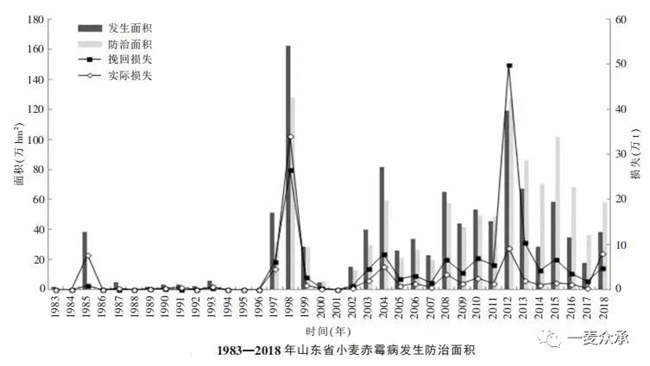 圖7 小麥赤霉病在全國(guó)的發(fā)生趨勢(shì)(全國(guó)農(nóng)業(yè)技術(shù)推廣服務(wù)中心)和山東省的發(fā)病情況(國(guó)棟,2019)
