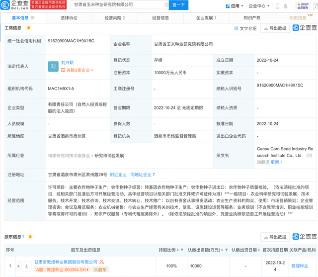 近日,甘肅省玉米種業(yè)研究院有限公司成立,法定代表人為劉興斌,注冊資本1億元人民幣,經(jīng)營范圍包含:主要農(nóng)作物種子生產(chǎn);農(nóng)作物種子經(jīng)營;轉基因農(nóng)作物種子生產(chǎn);農(nóng)作物種子進出口;農(nóng)作物種子質量檢驗等。企查查股權穿透顯示,該公司由敦煌種業(yè)(600354)100%控股。