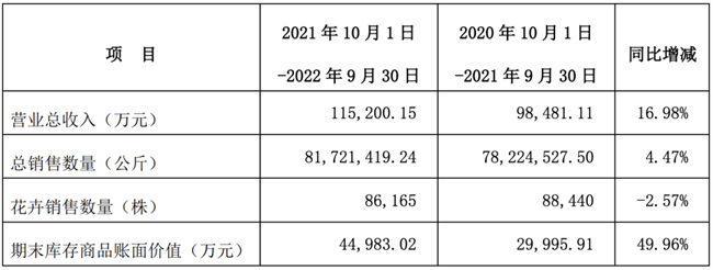 登海種業(yè)11月7日公告,2021年10月1日-2022年9月30日營業(yè)總收入11.52億元,同比增長16.98%;總銷售數(shù)量8172.14萬公斤,同比增長4.47%。